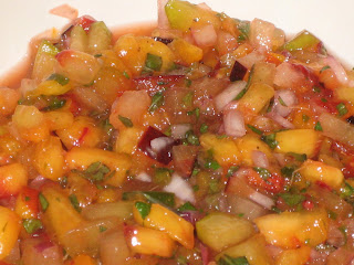 Looking for something different to with fruit besides just eating it? Try this unique take on salsa, not only does it utilize the best of summer’s in-season fruits, it’s a great dip for chips or topping for tacos & meats!